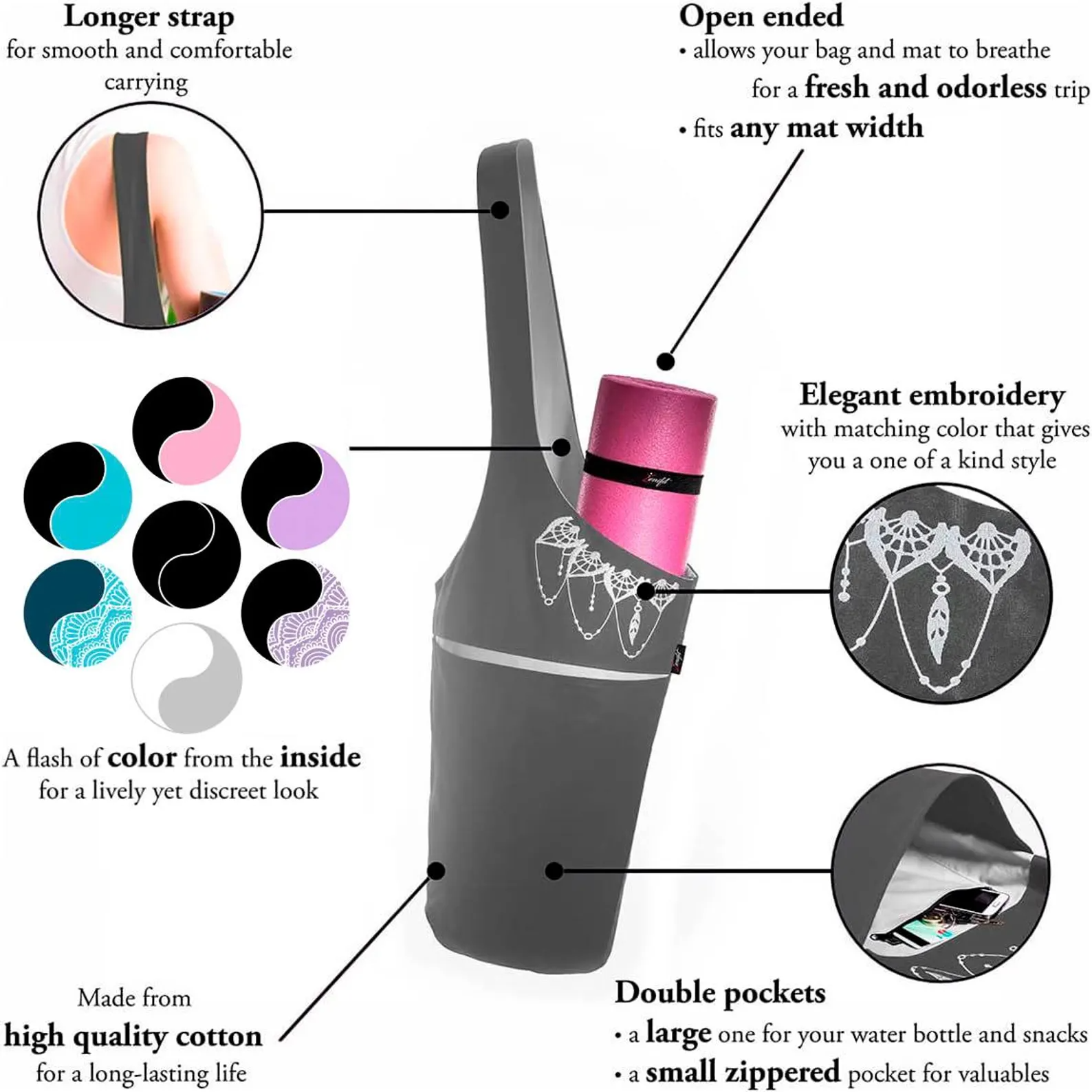 SUBTLE: Some yoga mat bags CAN look like telescope holders! But no one will think that about YOUR Olaise bag. With a lively embroidered dreamcatcher design in 5 discreet colors to choose you can match or contrast your bag to your yoga gear, outfit or your favorite chakra. Available in Black with either Azure Blue, Lavender Purple or Pink accents, in Gray with White or in two tone Teal. Which one speaks to you today?